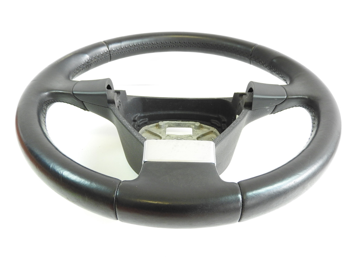 Tříramenný volant v kůži, použitý, pro vozy Volkswagen. Bez podvolantových přepínačů. Číslo dí..